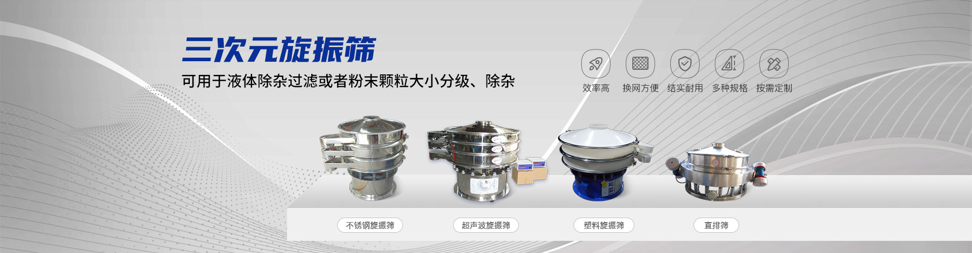 公司的主要產(chǎn)品有:三次元旋振篩、直線(xiàn)振動(dòng)篩、圓形搖擺篩、方形搖擺篩、脫水篩、超聲波振動(dòng)篩、塑料振動(dòng)篩、直排篩、高頻篩、450過(guò)濾篩、實(shí)驗(yàn)篩、斗式提升機(jī)、皮帶輸送機(jī)、過(guò)濾器、振動(dòng)電機(jī)等,
