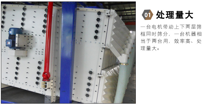 1、處理量大,效率高。多層分級(jí)設(shè)計(jì),一機(jī)分兩組,一臺(tái)抵多臺(tái)使用,產(chǎn)量翻倍;