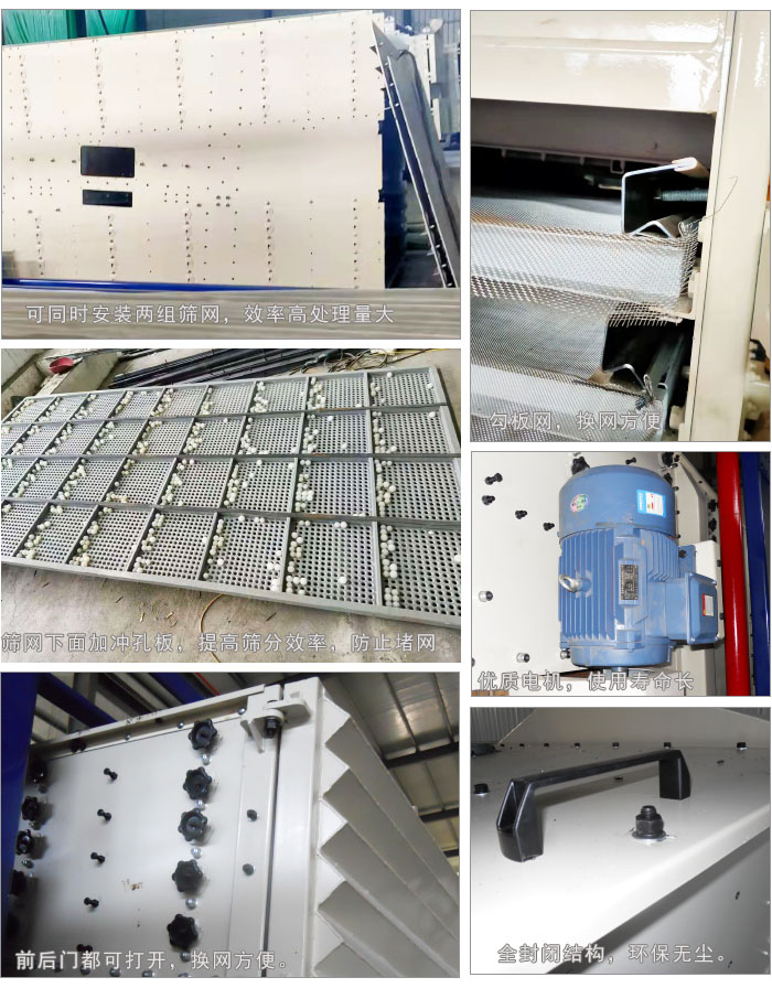 機(jī)制砂的原料為各種石塊,機(jī)制砂是指經(jīng)過一系列加工工藝形成的粒徑小于4.75mm的巖石顆粒。機(jī)制砂制備過程中常見的篩分粒度為5mm(4目)、2.36mm、1.2mm、0.6mm,部分特殊砂漿的精細(xì)度會更細(xì),篩分精度需求為0.3mm、0.15mm、0.075mm。方形搖擺篩可同時安裝1-6層篩網(wǎng),篩箱前后都可以打開,換網(wǎng)非常方便。而且篩網(wǎng)下面加清網(wǎng)裝置防止堵網(wǎng)。